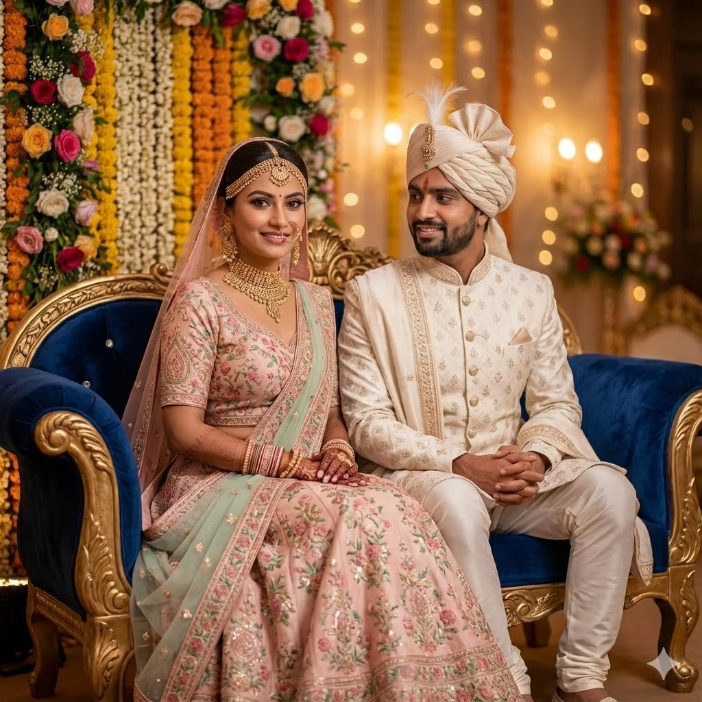 A luxurious seated portrait of the bride and groom on a royal sofa. Bride sits elegantly with hands on her lap, groom sits slightly angled towards her with a calm smile. Traditional floral decor behind them, warm glow, shallow depth of field. Make image Face same to same which i uploded