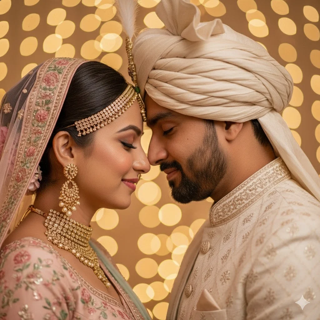 A tight close-up portrait of the couple standing close, forehead-to-forehead, smiling softly. Bridal jewellery sparkles, groom’s turban details clear. Background fully blurred with soft golden circles of light (bokeh). Ultra-sharp face details. Make image Face same to same which i uploded