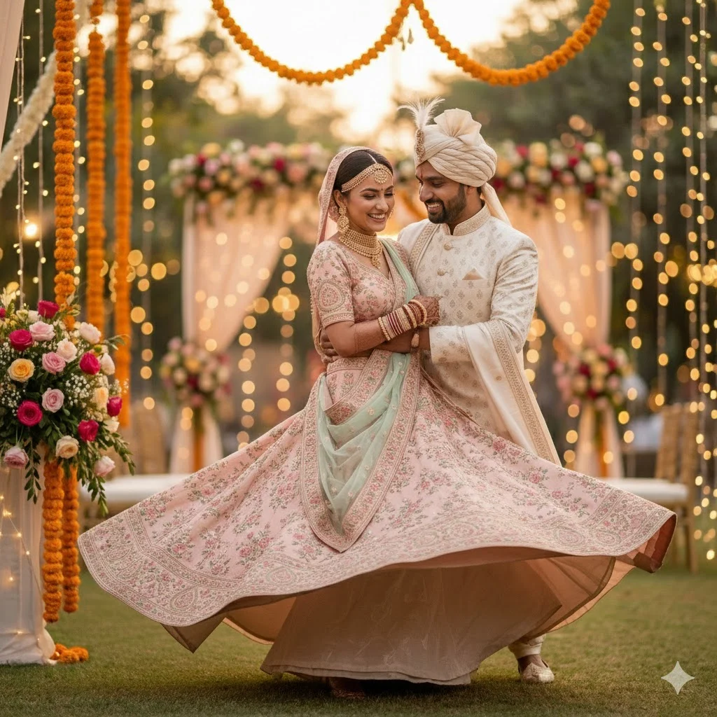 A joyful candid moment of the bride and groom dancing together. Groom gently holding bride’s waist, bride spinning lightly with her lehenga flare. Vibrant wedding lights in the background, warm festive mood, cinematic style. Make image Face same to same which i uploded