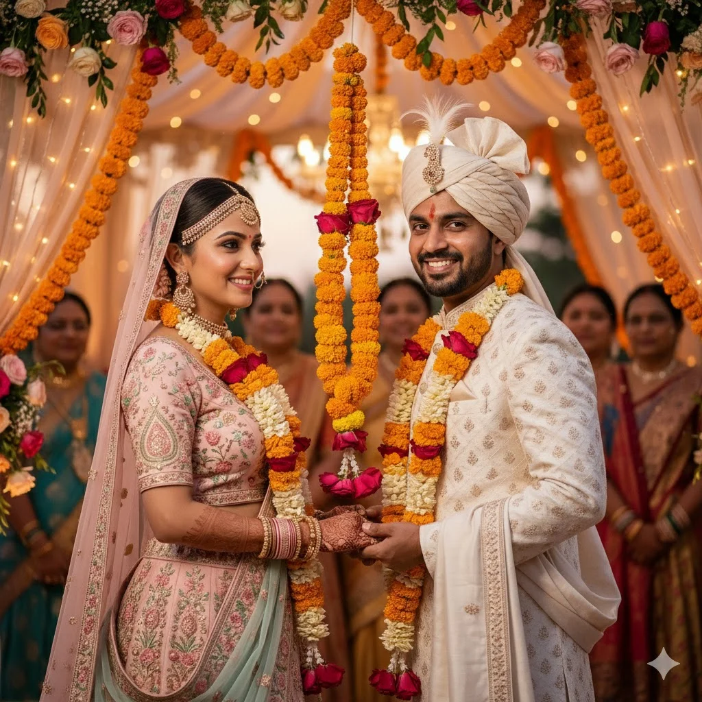 A high-resolution shot of the bride and groom exchanging garlands (varmala pose). Both smiling brightly, garlands mid-air. Background decorated with marigold strings, soft ambient lighting, colorful festive atmosphere. Make image Face same to same which i uploded