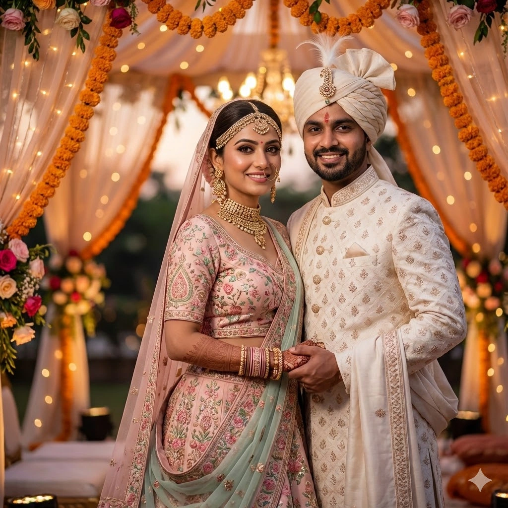 A high-resolution, cinematic Indian wedding portrait of a bride and groom standing closely and smiling warmly at the camera. The bride wears an elegant pastel-colored lehenga with intricate embroidery, heavy gold jewellery, a traditional maang-tikka, choker necklace, long earrings, bangles, and a soft bridal veil. The groom wears an off-white sherwani with detailed patterns and a matching turban decorated with a feather and brooch. They are holding hands gently, showing a natural emotional connection. Background features a beautifully decorated wedding mandap with vibrant floral arrangements and warm golden lighting, softly blurred for a premium depth-of-field effect. Capture a festive, joyful, romantic atmosphere with rich colors, soft glow, and perfect skin tones. make image Face same to same which i uploded